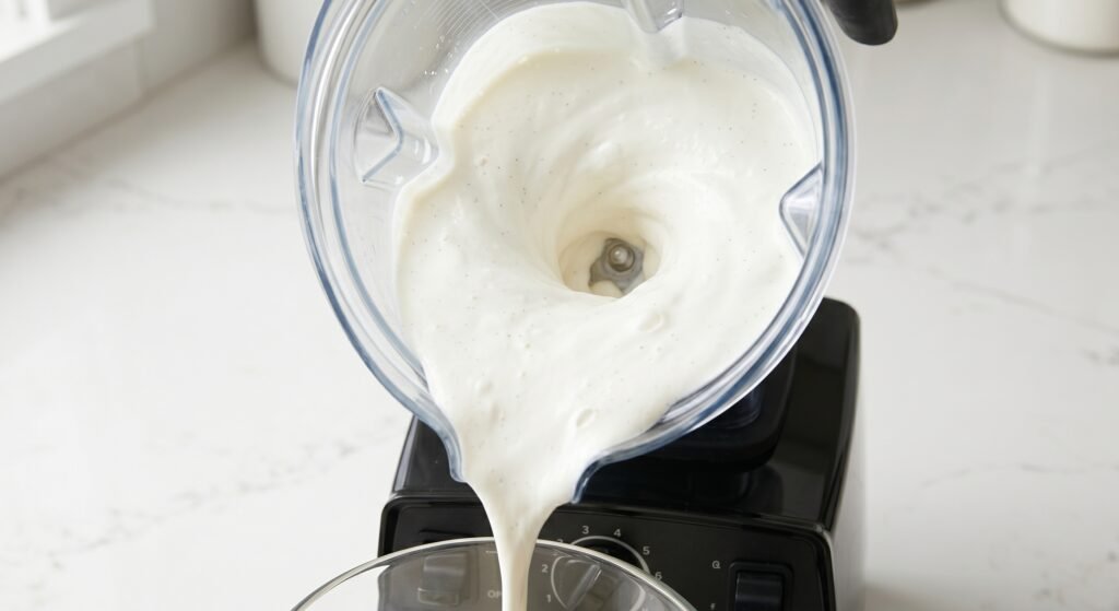 Step 1 — Blend Until Completely Smooth Add all ingredients to a blender or food processor. Blend on high for 45–60 seconds until absolutely no lumps remain. The mixture should look like a smooth, pourable milkshake. Any lumps will affect the final texture.